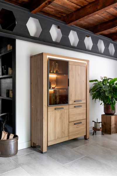 Deze bergkast uit collectie Delmonte heeft een klassieke en statige look. Deze staat perfect in authentieke interieurs en heeft veel weg van een massief houten kast door de structuur op de kastdeuren. Deze kasten zijn echter gemaakt van Primo Laminato (HPL), een hoogwaardig en onderhoudsvriendelijk materiaal. Deze kast heef een glazen deur, waar je achter de legplanken twee ledstrips kunt vinden. Daarnaast heeft de kast ook een mooie, dimbare ledstrip bovenaan om de kast extra mooi te verlichten. Verder heeft de kast nog twee handige kastdeuren en twee ruime lades. De kast is 120cm breed en 170cm hoog. Iets lager en iets breder dan de vitrinekast uit de gelijknamige collectie.