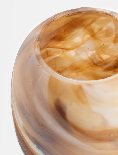 Deze glazen Jasper vaas is de middelste uit een serie van drie COCOmaison vazen van verschillende hoogte en allemaal net even anders van kleur en tekening. Hij heeft een afmeting van 21x21x23cm (bxdxh) en een marmerachtige tekening in oranjebruine tinten. Het enigezins transparante glas en de sierlijke vorm geven de vaas een elegante uitstraling die past in zowel een meer klassieke als moderne inrichting. Zelfs zonder een mooi boeket is dit een tijdloos woonaccessoire, dat helemaal aansluit op de natuurtrend in styling.