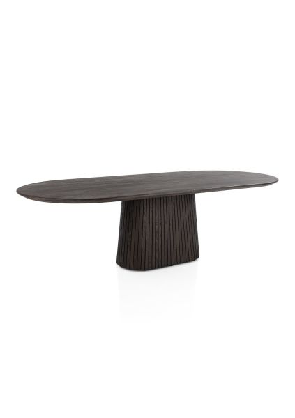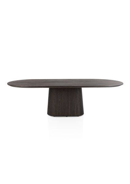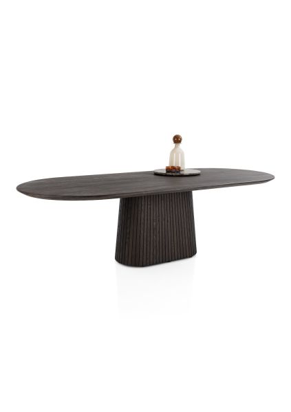 De Ravello eetkamertafel is een echte blikvanger dankzij het moderne design met afgeronde vormen en verfijnde latjes. Het tafelblad is gemaakt van massief eiken en het onderstel van eikenfineer in een diepe basaltkleur die warmte en karakter toevoegt aan je eethoek. De matte platinumlak zorgt voor een luxe uitstraling en biedt extra bescherming bij dagelijks gebruik. Deze tafel past perfect in een stijlvol interieur en is onderdeel van de complete Ravello-collectie, waardoor combineren eenvoudig is.