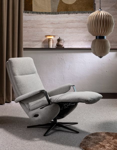Relaxfauteuil SELLA valt op door zijn moderne vormgeving. Het stoere design voelt tegelijk elegant aan, terwijl de metalen armen en stervormige draaipoot zorgen voor een subtiele retro look. Met de elektrische relaxfunctie bewegen zitgedeelte en beensteun traploos als één geheel. De hoofdsteun is handmatig verstelbaar. SELLA is verkrijgbaar in diverse stoffen en kleuren uit de Selected Choices collectie. De metalen poot is leverbaar in grafiet of steel brown. Voor plaatsing zonder snoer is een versie met accu beschikbaar.