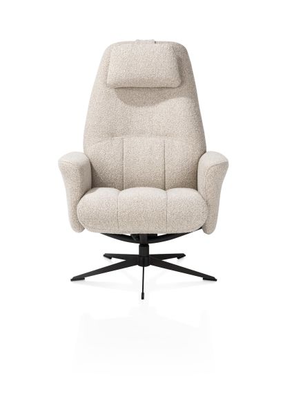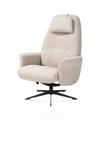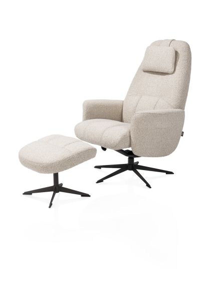 De Torino relaxfauteuil met poef is een perfecte combinatie van comfort en eigentijdse elegantie. De brede zitting is bekleed met de zachte boucléstof Cloudy in de kleur beige, een lichte tint die rust brengt in je interieur. Dankzij de stevige stoffering is deze fauteuil ideaal voor intensief gebruik. De rugleuning is handmatig verstelbaar zodat je eenvoudig jouw ideale zithouding vindt. Het draaibare frame in grafietkleur zorgt voor een moderne uitstraling en is voorzien van een automatische terugdraaimogelijkheid. Met de bijpassende poef creëer je een complete relaxplek waar je elk moment van de dag van kunt genieten.