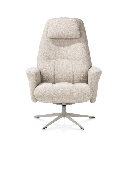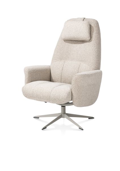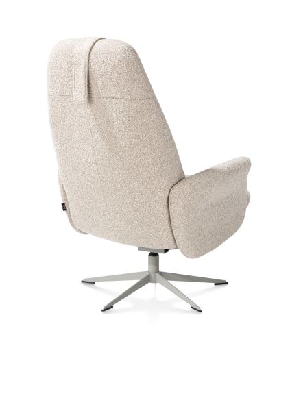 De Torino relaxfauteuil met poef is een comfortabele en stijlvolle aanvulling op je interieur. Deze uitvoering is bekleed met de boucléstof Cloudy in beige, een rustige en zachte tint die warmte en elegantie uitstraalt. De stof is stevig, voelt aangenaam aan en is geschikt voor intensief gebruik. De handmatig verstelbare rugleuning zorgt ervoor dat je de stoel precies naar wens kunt instellen. Het draaibare frame in de kleur silk grey voegt een subtiel en modern accent toe en beschikt over een automatische terugdraaimogelijkheid. Samen met de bijpassende poef biedt Torino het ultieme zitcomfort voor elk moment van de dag.
