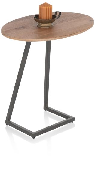 De Trapani collectie bevat meerdere bijzettafels, waaronder deze laptoptafel. Handig als je 's avonds op de bank nog even wat mails wilt beantwoorden of een tv-programma wilt volgen via een tweede scherm. De tafel is 60cm hoog en het ovale blad heeft een afmeting van 55x40cm. Door de afwijkende hoogte combineert hij speels met de andere bijzettafels die je leuk kunt groeperen tot een tafelset. Het smoked mangiferafineer is gelakt en het onderstel is van donker metaal.