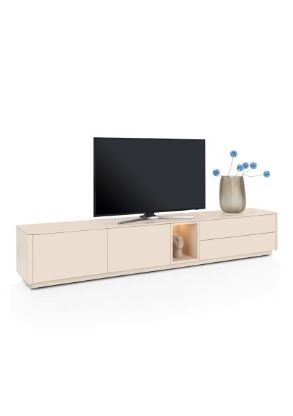 Dit extra brede TRENTINO lowboard van 270 cm is uitgevoerd in crème gelakt MDF en brengt licht en elegantie in het interieur. Het minimalistische design zonder handgrepen wordt gecombineerd met een praktisch push-to-open systeem. De indeling met 2 deuren, 2 laden en een sfeervol verlichte niche maakt het meubel veelzijdig in gebruik. De meekleurende plint wordt standaard meegeleverd, evenals het meekleurende metalen onderstel. Een grafietkleurig onderstel is tegen meerprijs verkijgbaar. Het lowboard kan ook hangend aan de muur bevestigd worden. Dit lowboard is ook verkrijgbaar in de kleur olijfgroen.
