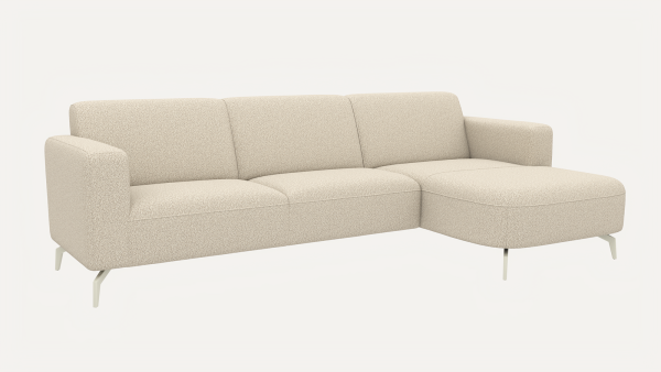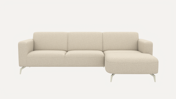 Ben je op zoek naar een moderne hoekbank die strak oogt én comfortabel zit? Dan zit je goed met deze TWIST-opstelling. De combinatie van longchair (chaise longue) rechts en een 2,5-zits met arm links vormt een ruime hoekopstelling met een zachte, afgeronde uitstraling. De bank is bekleed met boucléstof Brioni in de kleur kiezel en staat op elegante metalen designpoten in de kleur silk grey. Dankzij de pocketvering geniet je van een heerlijk zitcomfort.