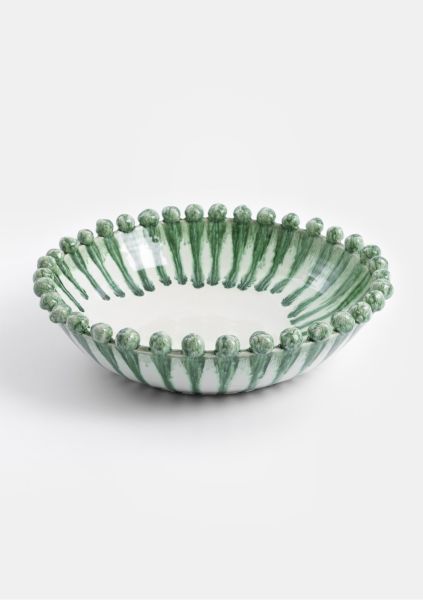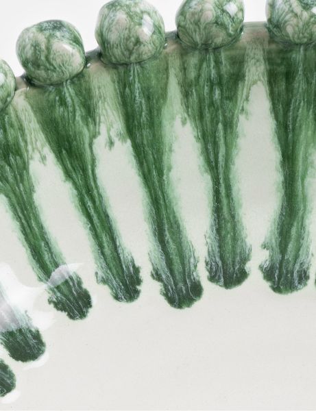 De keramieken Willem schaal van COCOmaison is een sieraad op tafel en multifunctioneel in gebruik. Hij heeft een doorsnede van 40 cm en is 11 cm hoog. Je kunt de schaal als fraaie woonaccessoire leeg op tafel zetten, maar het formaat maakt hem heel geschikt als fruitschaal of om ander lekkers op te serveren. De vormgeving is speels en past mooi bij dat van de vaas en hoge pot uit dezelfde serie. Alle drie de ontwerpen zijn hangeschilderd, dus weet je zeker dat je een uniek object in huis haalt, waarvan er geen tweede bestaat.